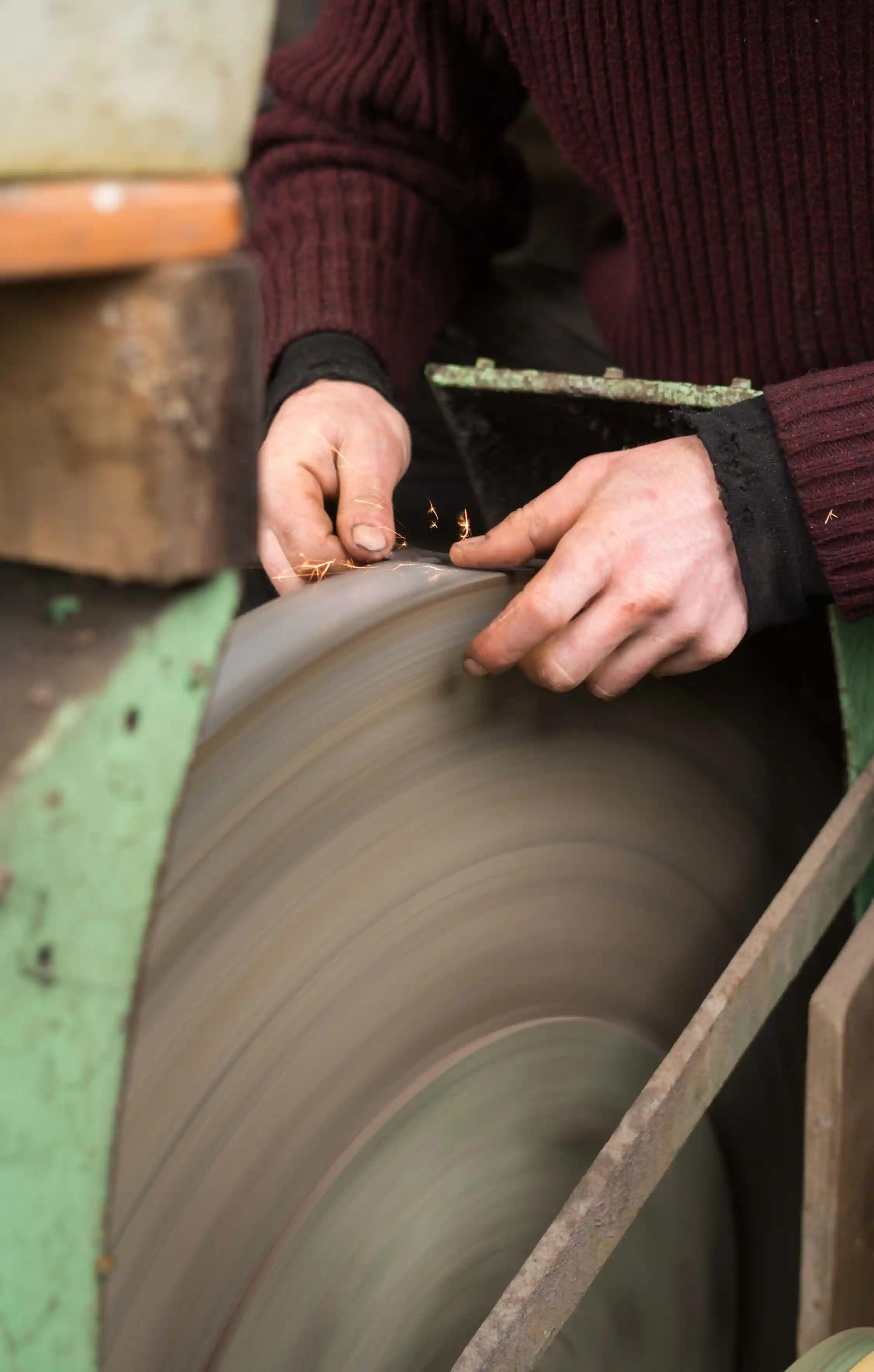Viennent ensuite les étapes d’émouture, de mise au tranchant et de polissage, pour lesquelles Martin emploi pour partie des techniques et des machines anciennes, empruntées à la tradition coutelière thiernoise, à l’instar des meules à eau et des tourets à disques émerisés. Ce choix de techniques de finition contribue à respecter les matières, en particulier l’acier trempé, tout en conférant une sobriété globale à la production par limitation des déchets, notamment de bandes abrasives d’usure trop rapide dans un contexte de production importante.