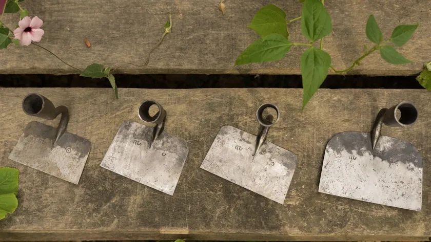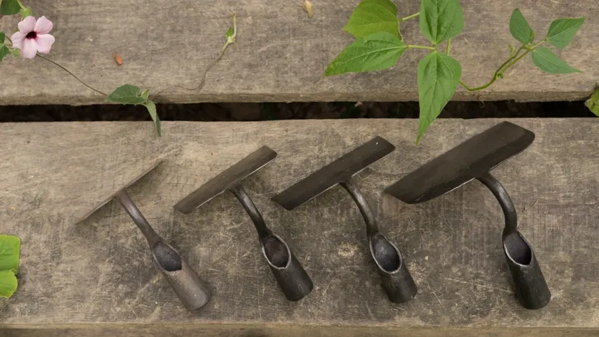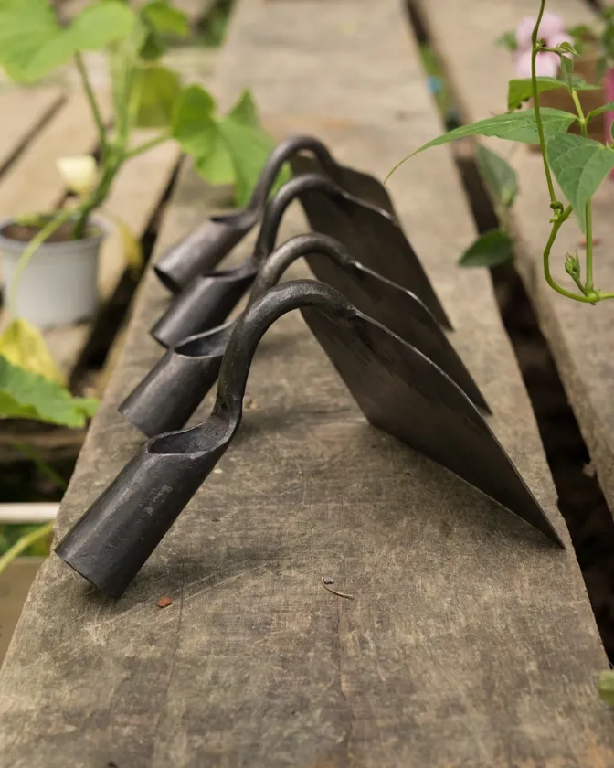 Forgées dans une pièce de fer puddlé (recyclage de cerclages de roues en bois) et aciérée (mise en acier C70) en « gueule de loup» par soudure au feu qui rend la lame auto-affutante par l'usure.