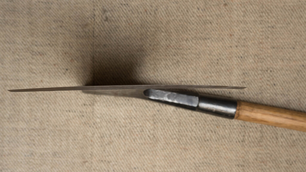 Elle est caractérisée par une douille à pan, ainsi qu'une nervure centrale qui confère une plus grande rigidité à sa large lame plane.