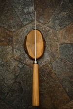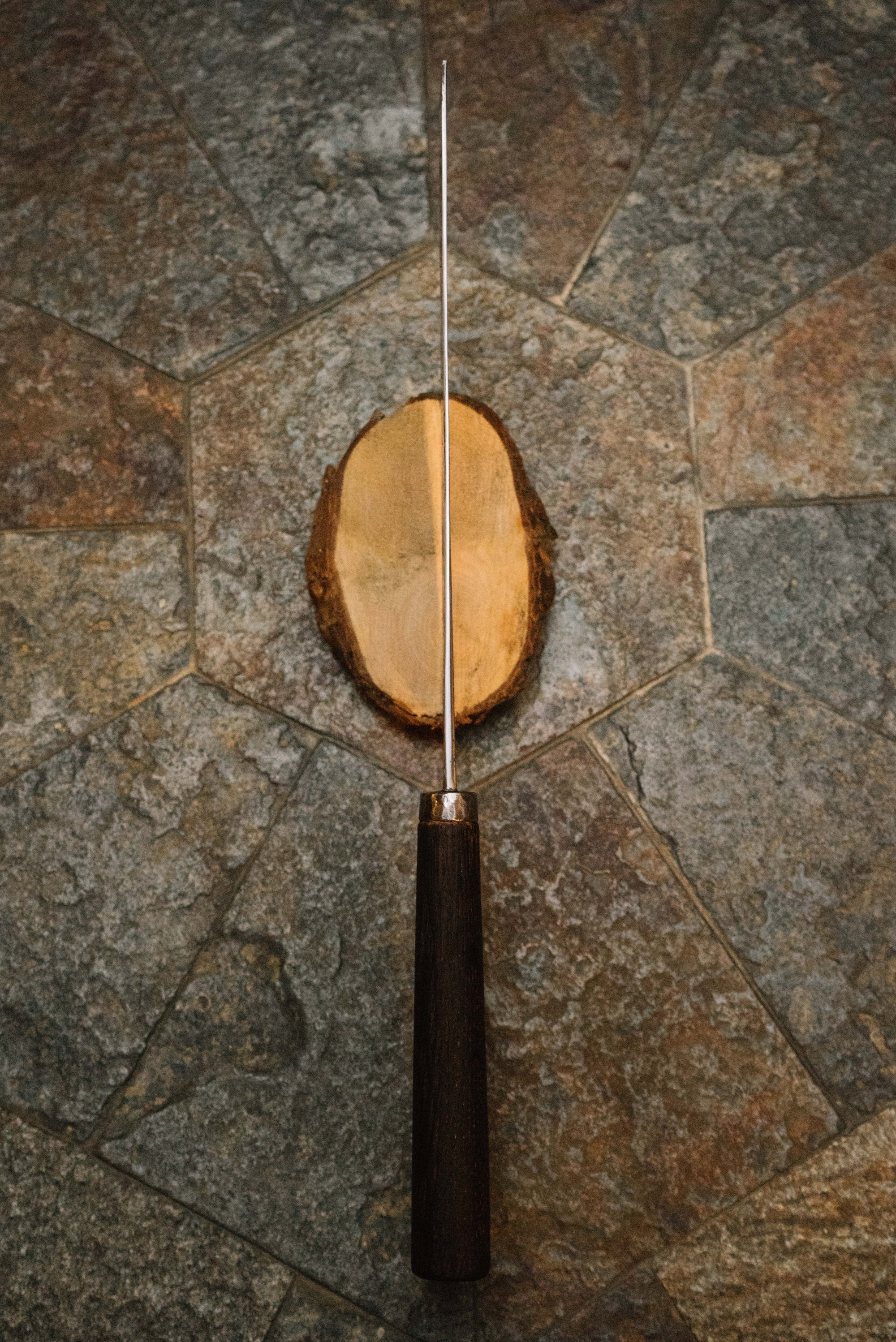 Le nakiri est un couteau inspiré d'un modèle japonais, idéal pour émincer fruits et légumes en fines tranches. Sa lame laissée brute de forge et légèrement creuse au dessus de l'émouture permet un décollement facile des tranches coupées, ce qui rend d'autant plus agréable son usage.