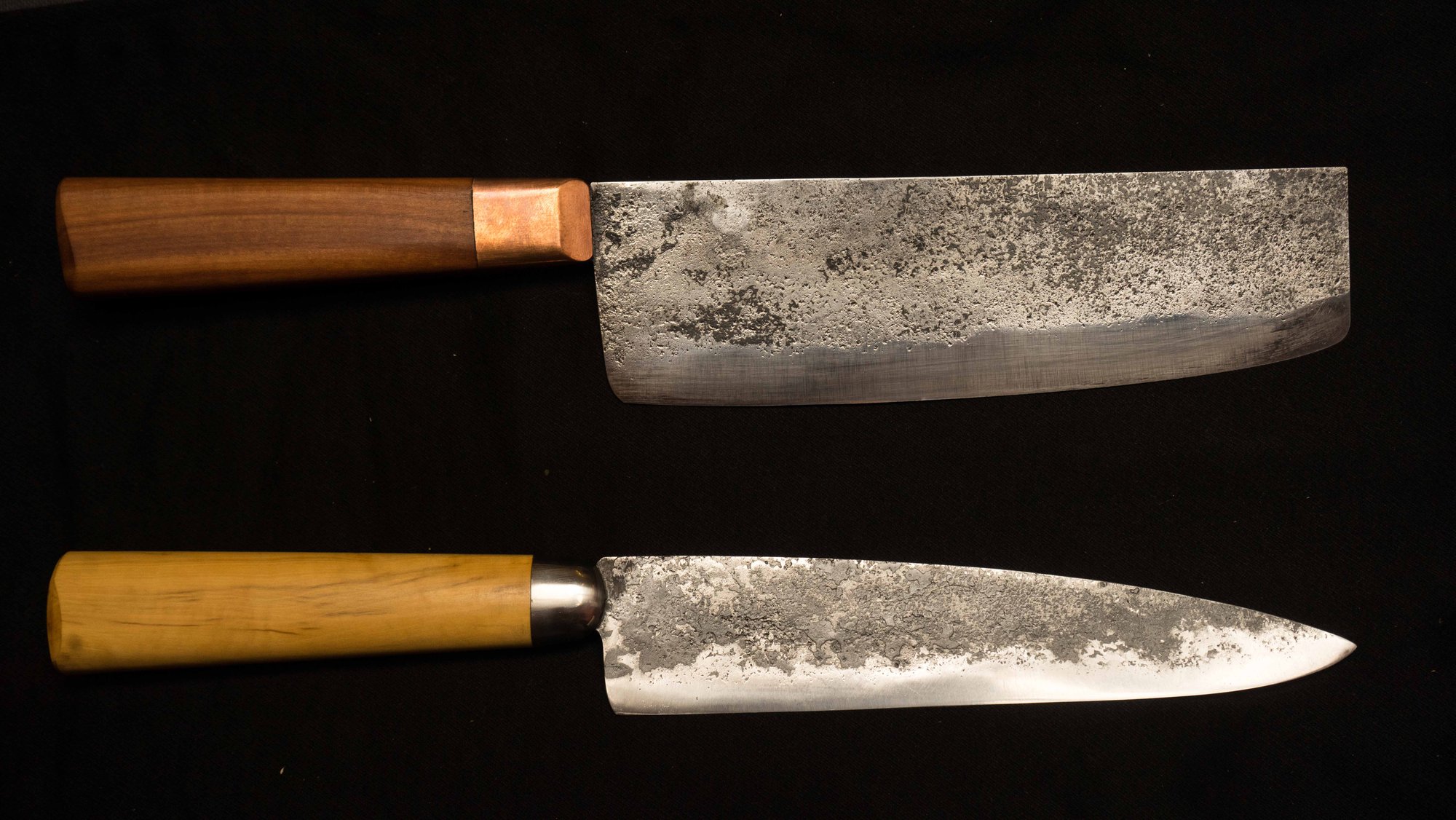 Deux couteaux de cuisine : un nakiri (sur la première photo, celui du haut), et un trancheur (sur la première photo, celui du bas)